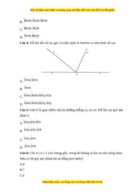 Các góc cần tìm là xO ; m mO ; n mO ; y xOy Đáp án cần ch n ọ là: B Câu 5: M i