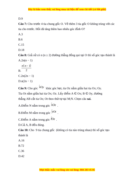 Câu 10: Cho 9 tia chung gốc (không có tia nào trùng nhau) thì s góc t ố o ạ thành là A.16 B.72 C.36 D.42 M i
