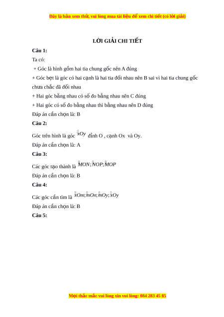 Đây là bản xem th , vu ử i lòng mua tài li u ệ đ xe ể m chi ti t ế (có l i ờ gi i ả ) L I Ờ GIẢI CHI TI T Ế Câu 1: Ta có: + Góc là hình g m ồ hai tia chung g c ố nên A đúng + Góc b t ẹ là góc có hai c nh ạ là hai tia đ i