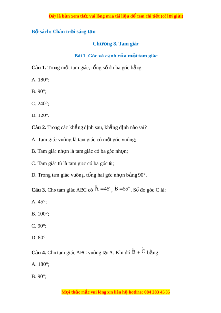Câu 3. Cho tam giác ABC có o A 4 5 , o B 5 5 . Số đo góc C là: A. 45°; B. 100°; C. 90°; D. 80°.