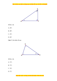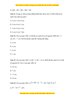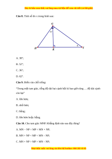 Câu 8. Tính số đo x trong hình sau: A. 38°; B. 52°; C. 36°; D. 62°. Câu 9. Đi n vào ch ề ỗ trống: “Trong m t ộ tam giác, tổng đ dài ộ hai c nh b ạ t ấ kì bao gi cũng … đ ờ dài ộ c nh ạ còn l i ạ ” A. l n h ớ n; ơ B. nh h ỏ n; ơ C. b ng; ằ D. l n h ớ n ho ơ c ặ b ng. ằ