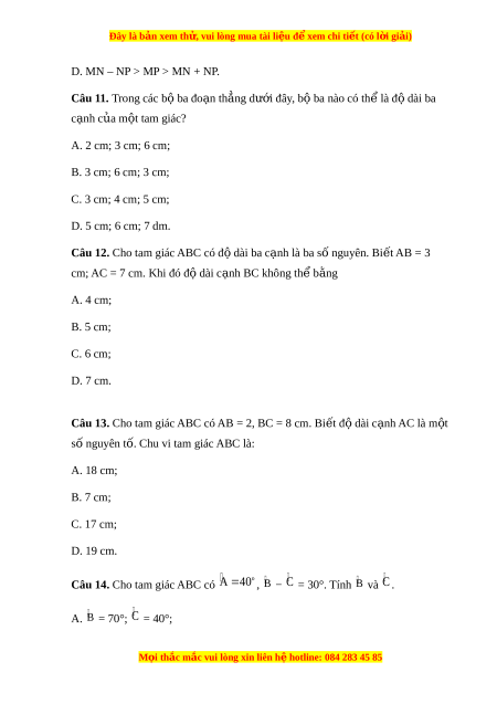 Câu 11. Trong các b ba đo n th ng d i đây, b ba nào có th là đ dài ba ộ ạ ẳ ướ ộ ể ộ