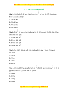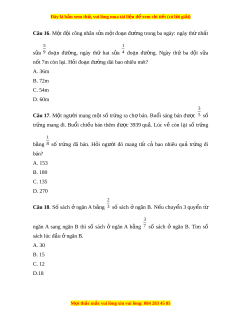 Câu 1. Khánh có 45 cái kẹo. Khánh cho Linh 3 số kẹo đó. H i ỏ Khánh cho Linh bao nhiêu cái k o? ẹ A. 30 cái kẹo B. 36 cái kẹo C. 40 cái kẹo D. 18 cái kẹo. 3 Câu 2. Bi t ế 5 số h c s ọ inh gi i ỏ c a l ủ p ớ 6A là 12 h c s ọ inh. H i ỏ l p ớ 6A có bao nhiêu h c s ọ inh gi i ỏ ? A. 12 h c s ọ inh gi i ỏ B. 15 h c ọ sinh gi i ỏ C. 14 h c ọ sinh gi i ỏ D. 20 h c s ọ inh gi i ỏ 4 Câu 3. Tìm chi u dài ề c a m ủ t ộ đo n đ ạ ư ng, bi ờ t ế r ng ằ 7 đo n đ ạ ư ng ờ đó dài 40km. A. 75km B. 48km C. 70km D. 80km 1 3