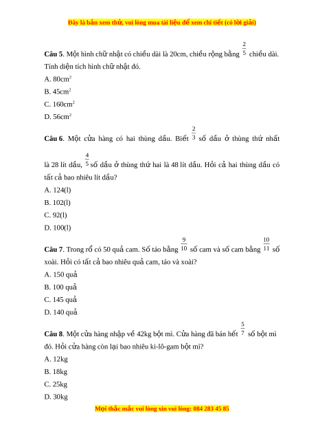 Đây là bản xem th , vu ử i lòng mua tài li u ệ đ xe ể m chi ti t ế (có l i ờ gi i ả ) 2 Câu 5. M t ộ hình chữ nh t ậ có chi u ề dài là 20cm, chi u r ề ng b ộ ng ằ 5 chi u ề dài. Tính di n t ệ ích hình ch nh ữ t ậ đó. A. 80cm2 B. 45cm2 C. 160cm2 D. 56cm2 2 Câu 6. M t ộ c a ử hàng có hai thùng d u. ầ Bi t ế 3 số d u ầ ở thùng thứ nh t ấ 4 là 28 lít d u,
