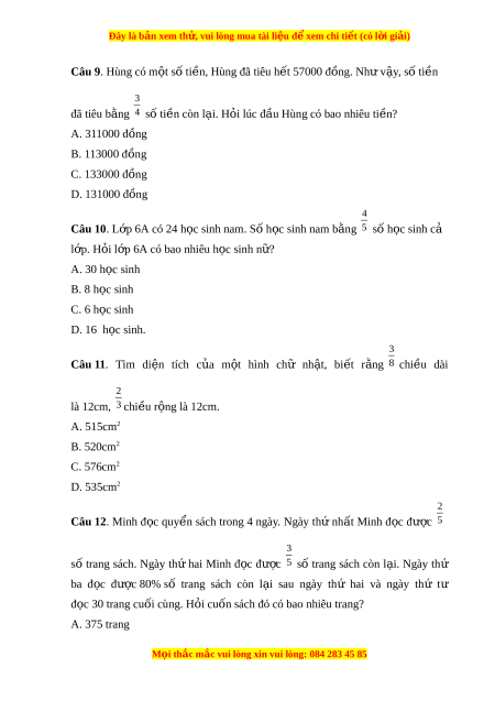 Đây là bản xem th , vu ử i lòng mua tài li u ệ đ xe ể m chi ti t ế (có l i ờ gi i ả ) Câu 9. Hùng có m t ộ số ti n, H ề ùng đã tiêu h t ế 57000 đồng. Như v y ậ , số ti n ề 3 đã tiêu b ng ằ 4 số ti n còn ề l i ạ . H i ỏ lúc đ u H ầ ùng có bao nhiêu ti n? ề A. 311000 đồng B. 113000 đồng C. 133000 đồng D. 131000 đồng 4 Câu 10. L p ớ 6A có 24 h c s ọ inh nam. S h ố c ọ sinh nam b ng ằ 5 số h c s ọ inh c ả l p. H ớ i ỏ l p ớ 6A có bao nhiêu h c s ọ inh n ? ữ A. 30 h c s ọ inh B. 8 h c ọ sinh C. 6 h c ọ sinh D. 16 h c s ọ inh. 3 Câu 11. Tìm di n ệ tích c a ủ m t ộ hình chữ nh t ậ , bi t ế r ng ằ 8 chi u ề dài 2 là 12cm, 3 chi u r ề ng l ộ à 12cm. A. 515cm2 B. 520cm2 C. 576cm2 D. 535cm2 2 Câu 12. Minh đ c ọ quy n
