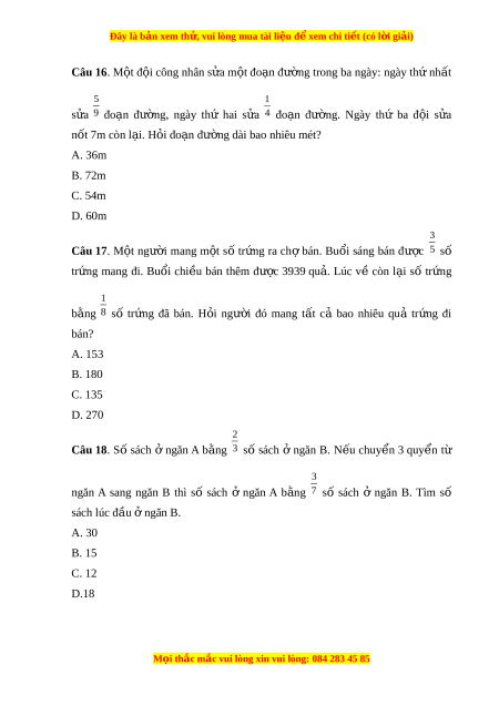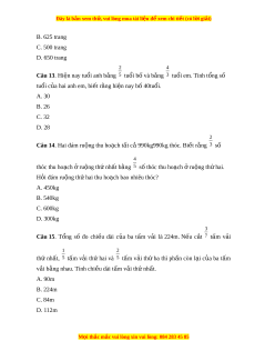 ấ cả 990kg990kg thóc. Bi t ế r ng ằ 3 số 4 thóc thu ho ch ạ ở ru ng ộ thứ nh t ấ b ng ằ 5 số thóc thu ho ch ạ r ở u ng ộ th hai ứ . H i ỏ đám ru ng t ộ h hai ứ thu ho ch ạ bao nhiêu thóc? A. 450kg B. 540kg C. 600kg D. 300kg 3 Câu 15. T ng ổ số đo chi u ề dài c a ủ ba t m ấ v i ả là 224m. N u ế c t ắ 7 tấm v i ả 1 2 thứ nh t ấ , 5 tấm v i ả thứ hai và 5 tấm v i ả thứ ba thì ph n ầ còn l i ạ c a ủ ba t m ấ v i ả b ng ằ nhau. Tính chi u dài ề t m ấ v i ả th nh ứ t ấ . A. 90m B. 224m C. 84m D. 112m M i