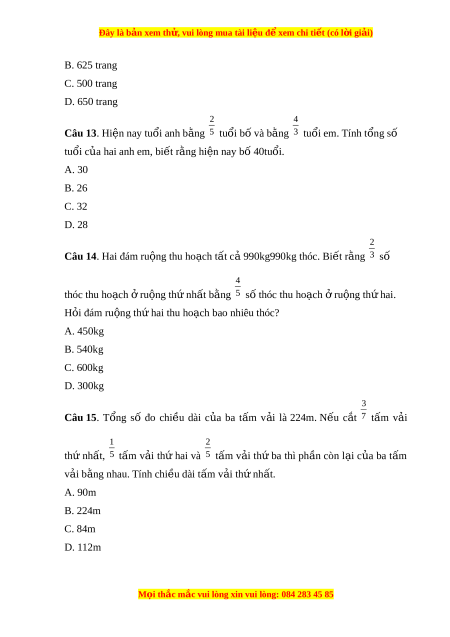 Đây là bản xem th , vu ử i lòng mua tài li u ệ đ xe ể m chi ti t ế (có l i ờ gi i ả ) B. 625 trang C. 500 trang D. 650 trang 2 4 Câu 13. Hi n nay t ệ uổi anh b ng ằ 5 tuổi bố và b ng