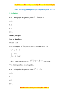 Đây là bản xem th , vu ử i lòng mua tài li u ệ đ xe ể m chi ti t ế (có l i ờ gi i ả ) Bài 5. Hai d ng ph ạ ư ng ơ trình quy v p ề hư ng t ơ rình b c hai ậ I. Nhận bi t ế Câu 1. Số nghi m ệ c a ph ủ ư ng ơ trình x 6 x (1) là: A. 1; B. 2; C. 3; D. 4. Hư ng ớ d n gi ẫ i ả Đáp án đúng là: A ĐKXĐ: x ≥ 0 Bình phư ng ơ hai v c ế a ph ủ ư ng ơ trình (1) ta đư c: ợ x + 6 = x2 x2 – x – 6 = 0 x 3 x 2 loai V i