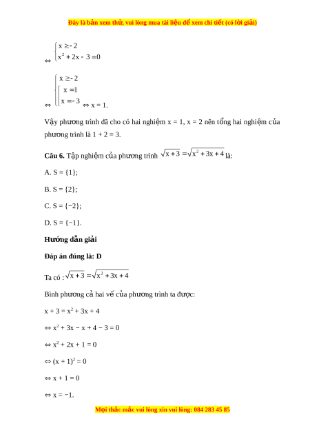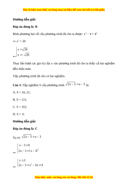 Đây là bản xem th , vu ử i lòng mua tài li u ệ đ xe ể m chi ti t (c ế ó l i ờ gi i ả ) Hư ng d ớ ẫn gi i ả Đáp án đúng là: B Bình phư ng hai ơ v c ế a ủ phư ng t ơ rình đã cho ta đư c: ợ x2 − 4 = 42 x2 = 20 x 20 x 20 Thay l n ầ lư t ợ các giá tr ịc a ủ x vào phư ng ơ trình đã cho ta th y ấ c ả hai nghi m ệ đ u t ề h a ỏ mãn. V y ậ phư ng t ơ rình đã cho có hai nghi m ệ . Câu 3. T p nghi ậ ệm S c a ph ủ ư ng ơ trình 2x 3 x 3 là: A. S = {6; 2}; B. S = {2}; C. S = {6}; D. S = . Hư ng d ớ ẫn gi i ả Đáp án đúng là: C Ta có: 2x 3 x 3 x 3 0 2x 3 x 3 2 x 3 2 2x 3 x 6x 9 M i ọ thắc m c