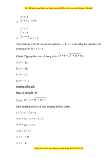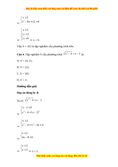 Đây là bản xem th , vu ử i lòng mua tài li u ệ đ xe ể m chi ti t ế (có l i ờ gi i ả ) x 3 2 x 8x 12 0 x 3 x 2 x 6 x = 6. V y S = {6} l ậ à t p nghi ậ m ệ c a ph ủ ư ng ơ trình trên. Câu 4. T p nghi ậ m ệ S c a ủ phư ng t ơ 2 rình x 4 x 2 là: A. S = {0; 2}; B. S = {2}; C. S = {0}; D. S = . Hư ng ớ d n gi ẫ i ả Đáp án đúng là: B 2 Ta có: x 4 x 2 x 2 0 x 4 x 2 2 2 x 2 2 2 x 4 x 4x 4 x 2 4x 8 0 x 2 x 2 x = 2. M i