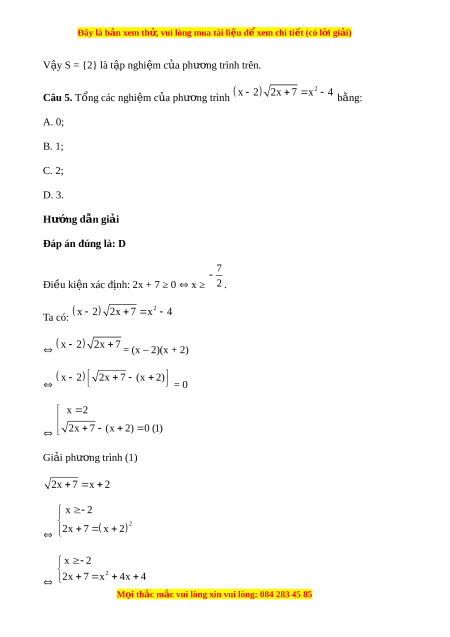 Đây là bản xem th , vu ử i lòng mua tài li u ệ đ xe ể m chi ti t (c ế ó l i ờ gi i ả ) V y ậ S = {2} là t p nghi ậ m ệ c a ủ phư ng t ơ rình trên. Câu 5. T ng các ổ nghi m ệ c a ph ủ ư ng ơ trình 2 x 2 2x 7 x 4 b ng: ằ A. 0; B. 1; C. 2; D. 3. Hư ng d ớ ẫn gi i ả Đáp án đúng là: D 7 Đi u ki ề ện xác đ nh: ị 2x + 7 ≥ 0 x ≥ 2 . Ta có: 2 x 2 2x 7 x 4 x 2 2x 7 = (x – 2)(x + 2)