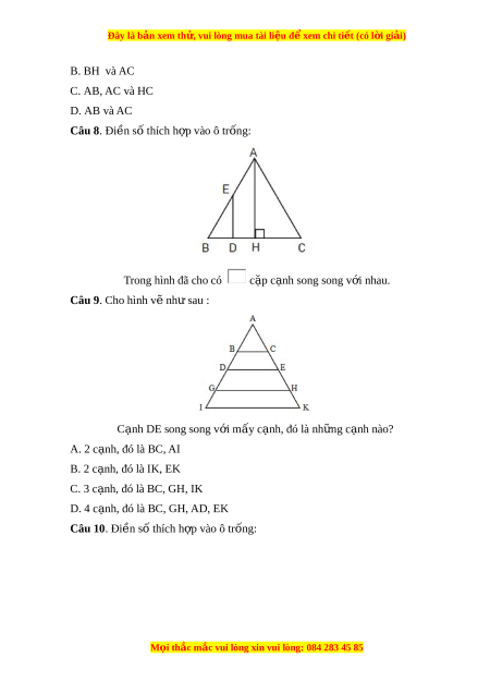 Đây là bản xem th , vu ử i lòng mua tài li u ệ đ xe ể m chi ti t ế (có l i ờ gi i ả ) C. D. Câu 7. Cho hình v nh ẽ ư sau: C nh ạ AH vuông góc v i ớ c nh nào d ạ ư i ớ đây? A. BH, HC và BC M i