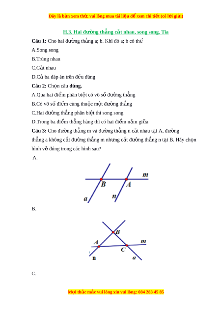 D.Cả ba đáp án trên đ u đúng ề Câu 2: Ch n ọ câu đúng. A.Qua hai đi m ể phân bi t ệ có vô số đư ng ờ th ng ẳ B.Có vô số đi m ể cùng thu c m ộ t ộ đư ng ờ th ng ẳ C.Hai đư ng ờ th ng phân bi ẳ t ệ thì song song D.Trong ba đi m ể th ng ẳ hàng thì có hai đi m ể n m ằ gi a ữ Câu 3: Cho đư ng t ờ h ng ẳ m và đư ng t ờ h ng ẳ n c t ắ nhau t i ạ A, đư ng ờ th ng ẳ a không c t ắ đư ng t ờ h ng ẳ m nh ng c ư t ắ đư ng t ờ h ng ẳ n t i ạ B. Hãy ch n ọ