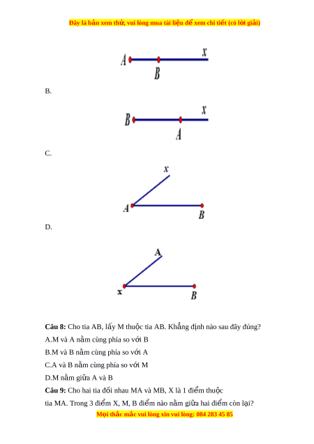 Câu 8: Cho tia AB, lấy M thu c ộ tia AB. Kh ng ẳ đ nh nào s ị au đây đúng? A.M và A n m ằ cùng phía so v i ớ B B.M và B n m ằ cùng phía so v i ớ A C.A và B n m ằ cùng phía so v i ớ M D.M n m ằ gi a ữ A và B
