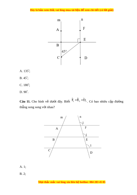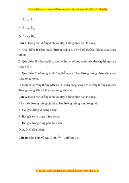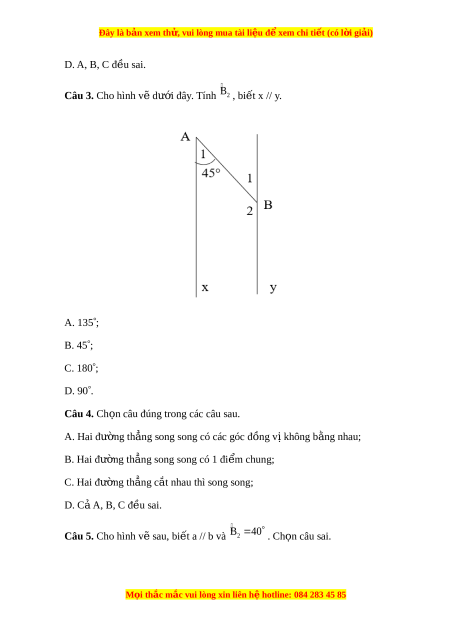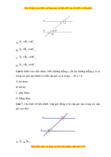 Đây là bản xem th , vu ử i lòng mua tài li u ệ đ xe ể m chi ti t ế (có l i ờ gi i ả ) A. A B 4 0 2 2 ; B. A B 140 1 1 ; C. A B 140 4 4 ; D. A B 1 40 3 3 . Câu 6. Đi n ề vào chỗ ch m ấ : N u ế đư ng ờ th ng ẳ c c t ắ hai đư ng ờ th ng ẳ a, b và trong các góc t o t ạ hành có m t ộ c p góc ặ so le trong … thì a // b. A. bù nhau; B. k bù; ề C. ph nhau; ụ D. b ng nhau. ằ