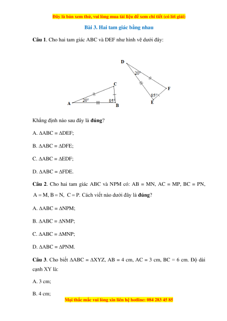 Câu 3. Cho biết ABC = XYZ, AB = 4 cm, AC = 3 cm, BC = 6 cm. Độ dài cạnh XY là: A. 3 cm; B. 4 cm;