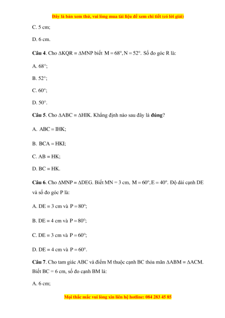 Câu 4. Cho KQR = MNP biết M = 68 , N = 52 . Số đo góc R là: A. 68°; B. 52°; C. 60°; D. 50°.