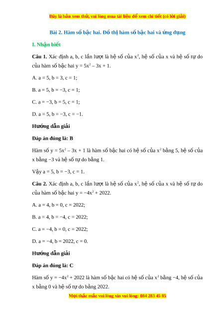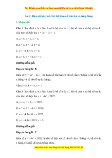 Bài 2. Hàm số bậc hai. Đồ th hàm ị s b ố c hai ậ và ng d ứ ng ụ I. Nhận bi t ế Câu 1. Xác đ nh ị a, b, c l n ầ lư t ợ là hệ số c a ủ x2, hệ số c a ủ x và hệ số tự do c a hàm ủ số b c hai ậ y = 5x2 – 3x + 1. A. a = 5, b = 3, c = 1; B. a = 5, b = −3, c = 1; C. a = −3, b = 5, c = 1; D. a = 5, b = −3, c = −1. Hư ng ớ d n gi ẫ i ả Đáp án đúng là: B