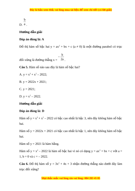 Câu 5. Hàm số nào sau đây là hàm số bậc hai? A. y = x3 + x2 – 2022; B. y = 2022x + 2021; C. y = 2021; D. y = x2 – 2022. Hư ng ớ d n gi ẫ i ả Đáp án đúng là: D