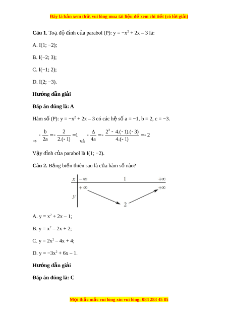 Đây là bản xem th , vu ử i lòng mua tài li u ệ đ xe ể m chi ti t ế (có l i ờ gi i ả ) b D. a . Hư ng ớ d n gi ẫ i ả Đáp án đúng là: A Đồ thị hàm số b c