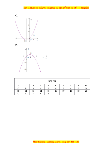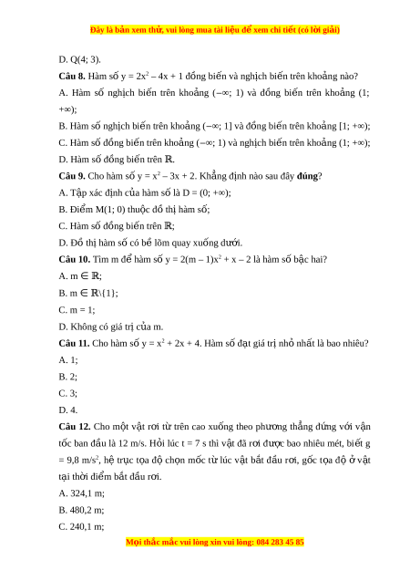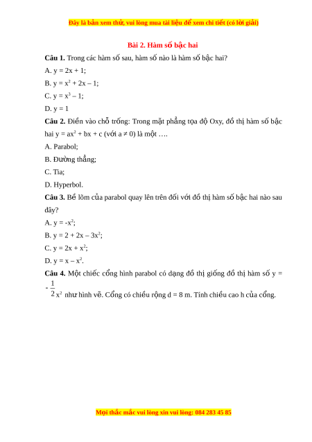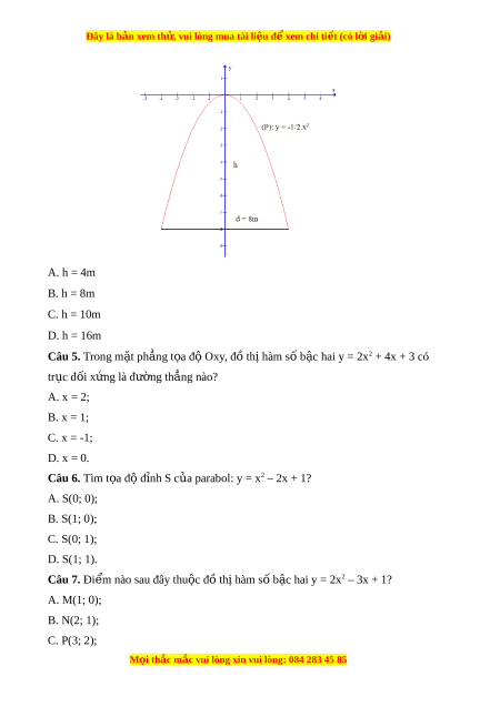 Đây là bản xem th , vu ử i lòng mua tài li u ệ đ xe ể m chi ti t (c ế ó l i ờ gi i ả ) A. h = 4m B. h = 8m C. h = 10m D. h = 16m Câu 5. Trong m t ặ ph ng t ẳ a ọ đ O ộ xy, đồ th hàm ị s b