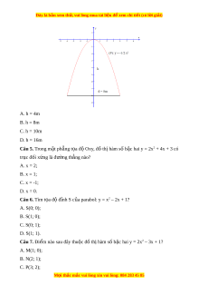 Câu 3. Bề lõm c a par ủ abol quay lên trên đ i ố v i ớ đ t ồ h hàm ị s b ố c ậ hai nào sau đây? A. y = -x2; B. y = 2 + 2x – 3x2; C. y = 2x + x2; D. y = x – x2. Câu 4. M t ộ chi c