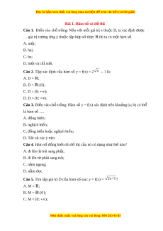 Đây là bản xem th , vu ử i lòng mua tài li u ệ đ xe ể m chi ti t ế (có l i ờ gi i ả ) Bài 1. Hàm s và đ ố t ồ h ị Câu 1. Đi n vào ch ề ỗ trống: N u ế v i ớ mỗi giá tr x t ị hu c ộ D, ta xác đ nh đ ị ư c ợ … giá trị tư ng ơ ng ứ y thu c t ộ p h ậ p ợ s t ố h c ự t ℝ hì ta có m t ộ hàm s . ố A. m t ộ ; B. hai; C. ba; D. m t ộ và chỉ m t ộ . Câu 2. T p xác đ ậ ịnh c a hàm ủ số y = f(x) = 2 x 1 l ‒ à: A. D = ; ℝ B. D = \ ℝ {0}; C. D = (0; +∞); D. D = [0; +∞). Câu 3. Đi n vào ch ề