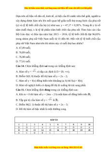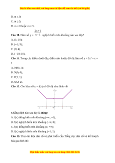 Câu 12. Cho hàm số y = f(x) có đ t ồ h nh ị hì ư nh v : ẽ Kh ng ẳ đ nh nào s ị au đây là đúng? A. f(x) đồng bi n t ế rên kho ng ả (‒∞; ‒1); B. f(x) nghịch bi n ế trên kho ng ả (‒∞; 0); C. f(x) đồng bi n t ế rên kho ng ( ả 1; +∞); D. f(x) nghịch bi n t ế rên kho ng ( ả ‒1; 1). Câu 13. Theo tài li u ệ dân số và phát tri n ể c a ủ T ng ổ c c ụ dân số và kế ho ch ạ hóa gia đình thì: M i ọ thắc m c