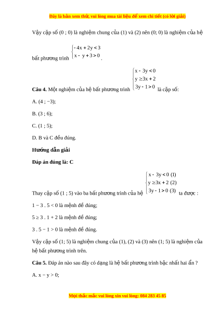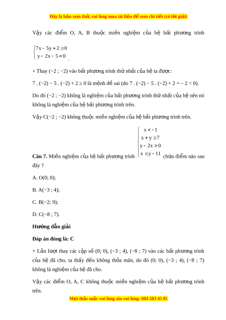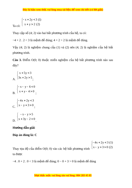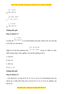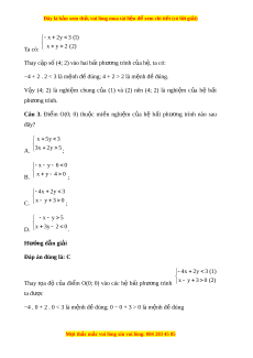Đây là bản xem th , vu ử i lòng mua tài li u ệ đ xe ể m chi ti t (c ế ó l i ờ gi i ả ) 2 x 4 0 B. 3x 4y 2 ; 2 y 2y 3 0 C. 5x y 2 ; x 4 y D. 3x 4y 2 . Hư ng d ớ ẫn gi i ả Đáp án đúng là: D x 4 y Ta th y ấ hệ 3x 4y 2 có hai b t ấ phư ng ơ trình b c ậ nh t ấ hai n ẩ cho nên đáp án D th a ỏ yêu c u đ ầ bài ề . 7x 5y 2 0 Câu 6. Cho hệ b t ấ phư ng ơ trình y 2x 5 0 . Trong các đi m ể sau đây, đi m ể không thu c ộ mi n ề nghi m ệ c a ủ h b ệ t ấ phư ng ơ trình là A. O(0; 0); B. A(2; 3); C. B(5; 4); D. C(−2; −2) . Hư ng d ớ ẫn gi i ả Đáp án đúng là: D + L n ầ lư t ợ thay các c p