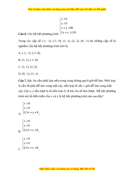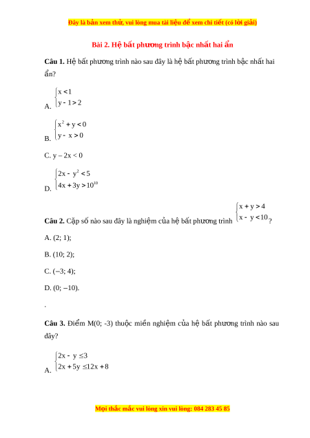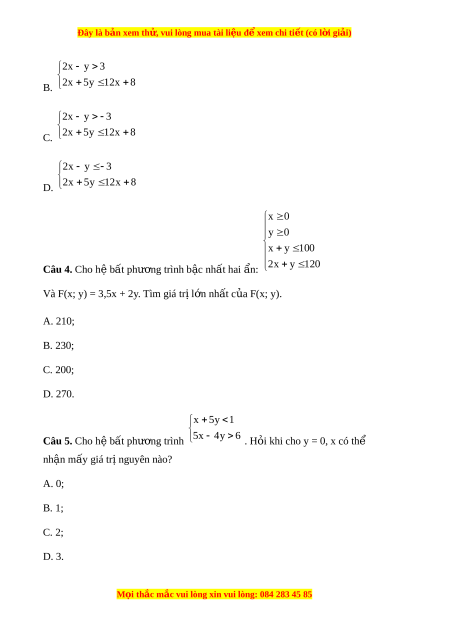 Đây là bản xem th , vu ử i lòng mua tài li u ệ đ xe ể m chi ti t (c ế ó l i ờ gi i ả ) 2x y 3 B. 2x 5y 1 2x 8 2x y 3 C. 2x 5y 1 2x 8 2x y 3 D. 2x 5y 12 x 8 x 0 y 0 x y 1 00 Câu 4. Cho h b ệ t ấ phư ng ơ trình b c ậ nh t ấ hai n: ẩ 2x y 120