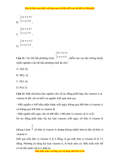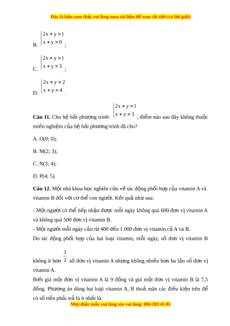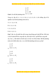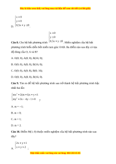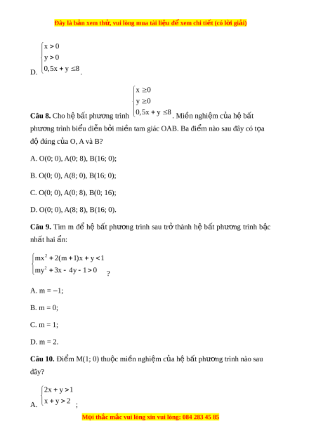 Đây là bản xem th , vu ử i lòng mua tài li u ệ đ xe ể m chi ti t (c ế ó l i ờ gi i ả ) x 0 y 0 D. 0,5x y 8 . x 0 y 0 Câu 8. Cho h b ệ t ấ phư ng ơ trình 0,5x y 8 . Mi n ề nghi m ệ c a h ủ b ệ t ấ phư ng ơ trình bi u di ể n b ễ i ở mi n t ề am giác OAB. Ba đi m ể nào sau đây có t a ọ độ đúng c a O ủ , A và B? A. O(0; 0), A(0; 8), B(16; 0); B. O(0; 0), A(8; 0), B(16; 0); C. O(0; 0), A(0; 8), B(0; 16); D. O(0; 0), A(8; 8), B(16; 0).