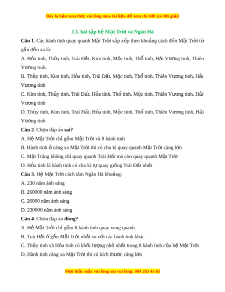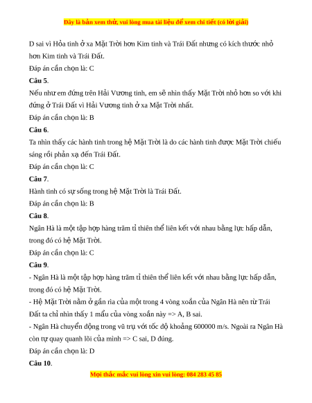 Đây là bản xem th , vu ử i lòng mua tài li u ệ đ xe ể m chi ti t (c ế ó l i ờ gi i ả ) D sai vì H a t ỏ inh xa ở M t ặ Tr i ờ h n ơ Kim tinh và Trái Đ t ấ nh ng có kí ư ch thư c ớ nh ỏ h n ơ Kim tinh và Trái Đ t ấ . Đáp án c n ch ầ n l ọ à: C Câu 5. N u ế nh em ư đ ng t ứ rên H i ả Vư ng t ơ inh, em s nhì ẽ n th y M ấ t ặ Tr i ờ nh h ỏ n s ơ o v i ớ khi đ ng ứ ở Trái Đất vì H i ả Vư ng ơ tinh xa M ở t ặ Tr i ờ nh t ấ . Đáp án c n ch ầ n l ọ à: B Câu 6.