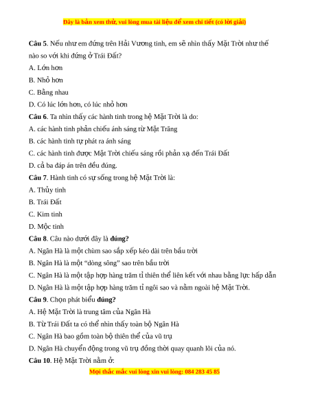 Đây là bản xem th , vu ử i lòng mua tài li u ệ đ xe ể m chi ti t (c ế ó l i ờ gi i ả ) Câu 5. N u ế nh em ư đ ng t ứ rên H i ả Vư ng t ơ inh, em s nhì ẽ n th y M ấ t ặ Tr i ờ nh t ư h ế nào so v i ớ khi đ ng ứ ở Trái Đ t ấ ? A. L n h ớ n ơ B. Nh h ỏ n ơ C. B ng ằ nhau D. Có lúc l n h ớ n, có l ơ úc nh h ỏ n ơ