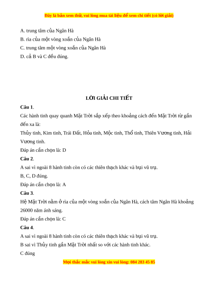 Đây là bản xem th , vu ử i lòng mua tài li u ệ đ xe ể m chi ti t (c ế ó l i ờ gi i ả ) A. trung tâm c a N ủ gân Hà B. rìa c a ủ m t ộ vòng xo n ắ c a N ủ gân Hà C. trung tâm m t ộ vòng xo n ắ c a N ủ gân Hà D. cả B và C đ u đúng. ề L I Ờ GIẢI CHI TI T Ế Câu 1. Các hành tinh quay quanh M t ặ Tr i ờ s p x ắ p t ế heo kho ng ả cách đ n ế M t ặ Tr i ờ t g ừ n ầ đ n xa ế là: Th y t ủ inh, Kim tinh, Trái Đ t ấ , H a ỏ tinh, M c t ộ inh, Th t ổ inh, Thiên Vư ng ơ tinh, H i ả Vư ng ơ tinh. Đáp án c n ch ầ n l ọ à: D Câu 2.