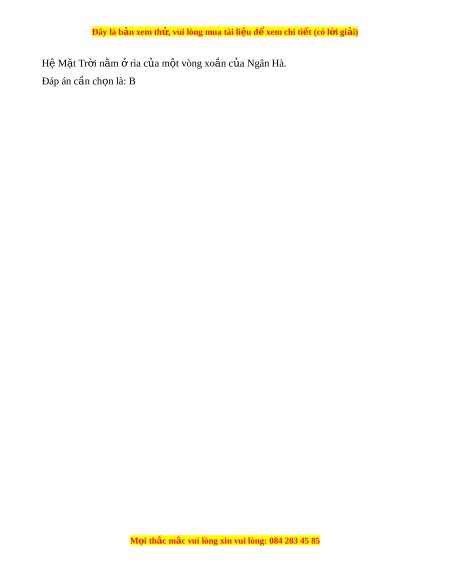 A sai vì ngoài 8 hành tinh còn có các thiên th ch ạ khác và b i ụ vũ tr . ụ B, C, D đúng. Đáp án c n ch ầ n l ọ à: A Câu 3. Hệ M t ặ Tr i ờ n m ằ ở rìa c a ủ m t ộ vòng xo n c ắ a