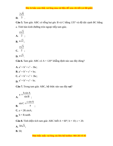 Câu 7. Trong tam giác ABC, hệ th c nào s ứ au đây sai? b.sin A a A. sin B ; c.sin A sin C B. a ; C. a = 2R.sinA; D. b = R.tanB. Câu 8. Tính di n t ệ ích tam giác ABC bi t ế A = 60°; b = 10; c = 20. A. 50 3 ; B. 50; M i