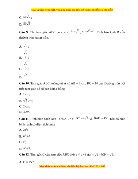 Câu 9. Cho tam giác ABC có a = 2, b 6 , c 3 1. Tính bán kính R c a ủ đư ng t ờ ròn ngo i ạ ti p. ế A. 2 ; 2 B. 2 ; 2 C. 3 ; 3 D.