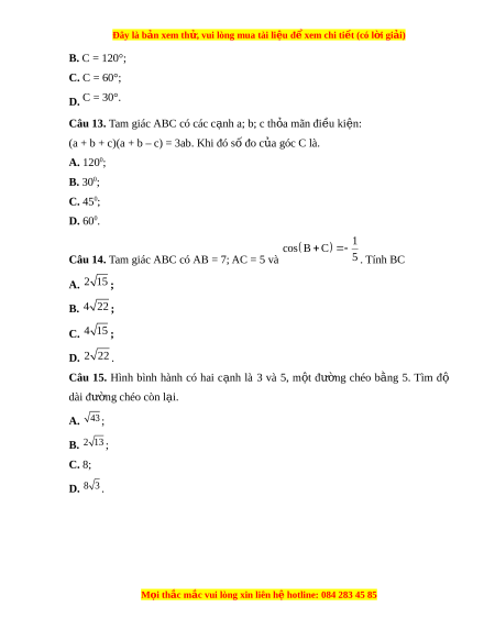 Đây là bản xem th , vu ử i lòng mua tài li u ệ đ xe ể m chi ti t (c ế ó l i ờ gi i ả ) B. C = 120°; C. C = 60°; D. C = 30°.