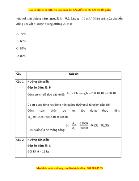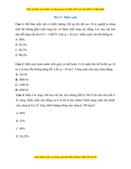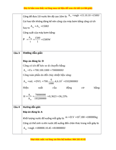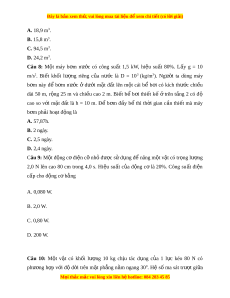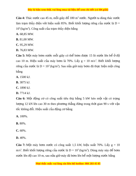 Đây là bản xem th , vu ử i lòng mua tài li u ệ đ xe ể m chi ti t (c ế ó l i ờ gi i ả ) Câu 4: Thác nư c ớ cao 45 m, m i ỗ giây đ ổ 180 m3 nư c. ớ Ngư i ờ ta dùng thác nư c ớ làm tr m ạ th y ủ đi n ệ v i ớ hi u ệ su t ấ 85%. Bi t ế kh i ố lư ng ợ riêng c a ủ nư c ớ là D = 103 (kg/m3). Công suất c a ủ tr m ạ th y đi ủ n b ệ ng ằ A. 68,85 MW. B. 81,00 MW. C. 95,29 MW. D. 76,83 MW. Câu 5: M t ộ máy b m ơ nư c ớ m i ỗ giây có thể b m ơ đư c ợ 15 lít nư c ớ lên b ể ở độ cao 10 m. Hi u ệ su t ấ c a ủ máy b m ơ là 70%. L y ấ g = 10 m/s2. Bi t ế kh i ố lư ng ợ riêng c a ủ nư c