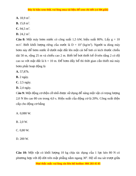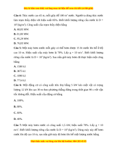Đây là bản xem th , vu ử i lòng mua tài li u ệ đ xe ể m chi ti t (c ế ó l i ờ gi i ả ) A. 18,9 m3. B. 15,8 m3. C. 94,5 m3. D. 24,2 m3. Câu 8: M t ộ máy b m ơ nư c ớ có công su t ấ 1,5 kW, hi u ệ su t ấ 80%. L y ấ g = 10 m/s2. Bi t ế kh i ố lư ng ợ riêng c a ủ nư c