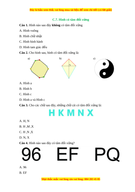 Câu 2. Cho hình sau, hình có tâm đ i ố x ng ứ là: A. Hình a B. Hình b C. Hình c D. Hình a và Hình c Câu 3. Cho các ch s ữ au đây, nh ng ch ữ cái ữ có tâm đối x ng l ứ à: A. H, N B. H ,M ,X C. H ,N ,X D. N, X