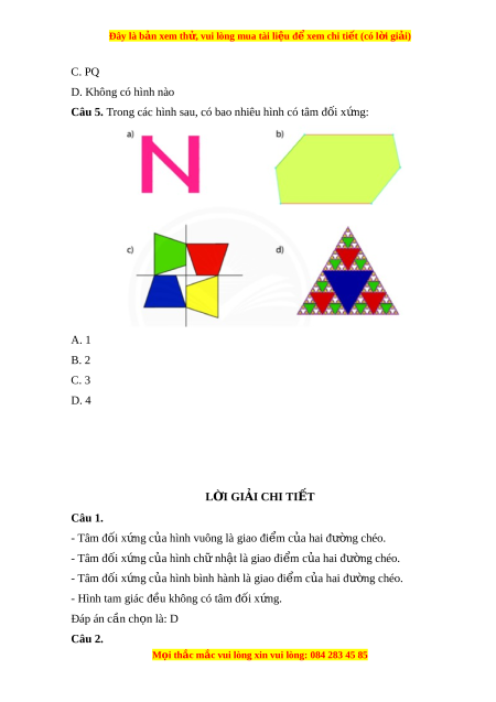 Câu 5. Trong các hình sau, có bao nhiêu hình có tâm đ i ố x ng: ứ A. 1 B. 2 C. 3 D. 4 L I Ờ GIẢI CHI TI T Ế Câu 1. - Tâm đối x ng c ứ a