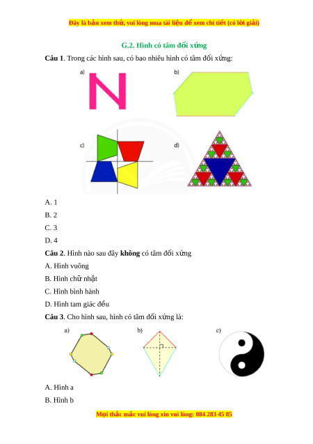 - Hình tam giác đ u không có t ề âm đ i ố x ng. ứ Đáp án cần ch n ọ là: D Câu 3. Hình a có tâm đối x ng: ứ M i