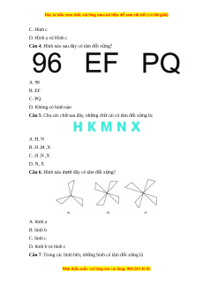 Câu 4. Hình nào sau đây có tâm đ i ố x ng? ứ A. 96 B. EF C. PQ D. Không có hình nào Câu 5. Cho các ch s ữ au đây, nh ng ch ữ cái ữ có tâm đối x ng l ứ à: A. H, N B. H ,M ,X C. H ,N ,X D. N, X