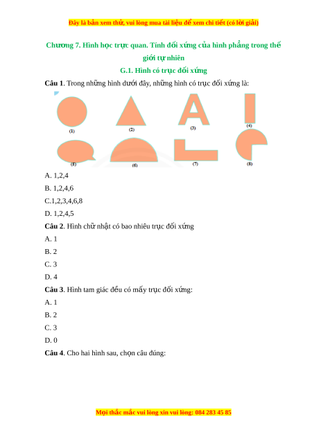 Đây là bản xem th , vu ử i lòng mua tài li u ệ đ xe ể m chi ti t ế (có l i ờ gi i ả ) Chư ng ơ 7. Hình h c ọ tr c quan. ự Tính đ i ố x ng c ứ a hì ủ nh ph ng t ẳ rong thế gi i ớ t nhi ự ên G.1. Hình có tr c đ ụ i ố x ng ứ Câu 1. Trong nh ng ữ hình dư i ớ đây, nh ng hì ữ nh có tr c đ ụ ối x ng l ứ à: A. 1,2,4 B. 1,2,4,6 C.1,2,3,4,6,8 D. 1,2,4,5 Câu 2. Hình ch nh ữ t ậ có bao nhiêu tr c ụ đ i ố x ng ứ A. 1 B. 2 C. 3 D. 4