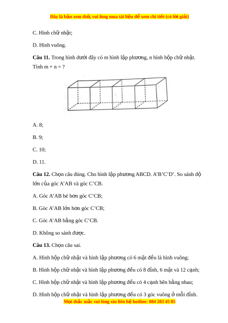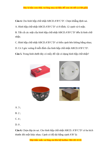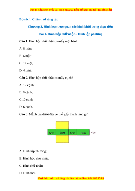 Đây là bản xem th , vu ử i lòng mua tài li u ệ đ xe ể m chi ti t ế (có l i ờ gi i ả ) Bộ sách: Chân tr i ờ sáng t o ạ Chư ng ơ 3. Hình h c ọ tr c quan các hì ự nh kh i ố trong th c t ự i n ễ Bài 1. Hình h p ch ộ nh ữ t ậ – Hình l p ph ậ ư ng ơ Câu 1. Hình h p ch ộ nh ữ t ậ có mấy m t ặ bên? A. 8 m t ặ ; B. 6 m t ặ ; C. 12 m t ặ ; D. 4 m t ặ . Câu 2. Hình h p ch ộ nh ữ t ậ có mấy c nh? ạ A. 12 c nh; ạ B. 8 c nh; ạ C.10 c nh; ạ D. 6 c nh. ạ Câu 3. M nh ả bìa dư i ớ đây có thể g p t ấ hành hình gì? A. Hình l p ph ậ ư ng; ơ B. Hình h p ch ộ ữ nh t ậ ; C. Hình chữ nh t ậ ; D. Hình thoi. M i ọ thắc m c