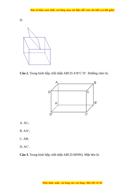 ậ ABCD.A’B’C’D’. Đư ng ờ chéo là: A. AC; B. AA’; C. AB; D. AC’. Câu 3. Trong hình h p ộ ch nh ữ t ậ ABCD.MNPQ. M t ặ bên là: M i