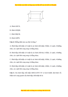 ịnh nào sau đây là đúng ? A. Hình h p ộ ch nh ữ t ậ có 6 m t ặ là các hình ch nh ữ t ậ , 8 đ nh, ỉ 12 c nh, ạ 4 đư ng ờ chéo, các c nh bên s ạ ong song và b ng nhau; ằ B. Hình h p ộ chữ nh t ậ có 6 m t ặ là các hình ch ữ thoi, 8 đ nh, ỉ 12 c nh, ạ 4 đư ng ờ chéo, các c nh bên s ạ ong song và b ng nhau; ằ C. Hình h p ộ chữ nh t ậ có 4 m t ặ là các hình ch ữ nh t ậ , 8 đ nh, ỉ 12 c nh, ạ 4 đư ng ờ chéo, các c nh bên s ạ ong song và b ng nhau; ằ D. Hình h p ộ ch nh ữ t ậ có 6 m t ặ là các hình ch nh ữ t ậ , 6 đ nh, ỉ 12 c nh, ạ 4 đư ng ờ chéo, các c nh bên s ạ ong song và b ng nhau. ằ Câu 5. Cho hình h p ộ chữ nh t
