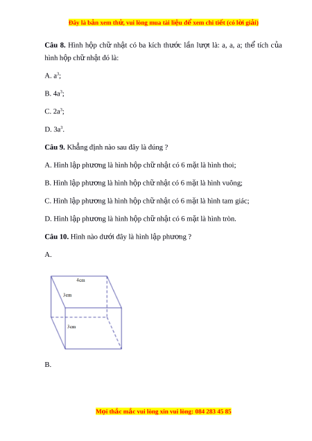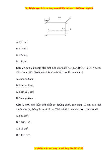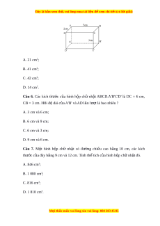 ậ ABCD.A'B'C'D' là DC = 6 cm, CB = 3 cm. H i ỏ đ dài ộ c a ủ A'B' và AD l n l ầ ư t ợ là bao nhiêu ? A. 3 cm và 6 cm; B. 6 cm và 9 cm; C. 6 cm và 3 cm; D. 9 cm và 6 cm. Câu 7. M t ộ hình h p ộ chữ nh t ậ có đư ng ờ chi u ề cao b ng ằ 10 cm, các kích thư c c ớ a ủ đáy b ng 9 cm ằ và 12 cm. Tính th t ể ích c a hì ủ nh h p ch ộ nh ữ t ậ đó. A. 846 cm3; B. 1 080 cm3; C. 816 cm3; D. 1 810 cm3. M i