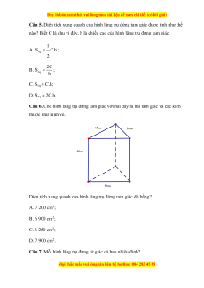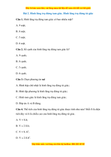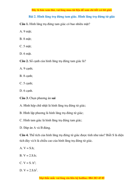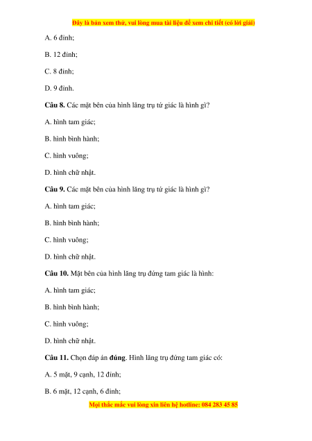 Câu 1. Hình lăng trụ đứng tam giác có bao nhiêu mặt? A. 9 mặt; B. 8 mặt; C. 5 mặt; D. 6 mặt.